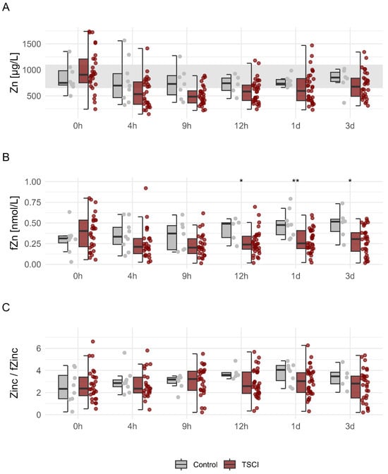 Dynamics of Serum Zn and fZn in individuals with TSCI compared to controls. Concentrations of total Zn (Panel (A)) and fZn (Panel (B)), as well as the ratio of total Zn to fZn (Panel (C)), measured at multiple time points post-TSCI. Panel A depicts the normal range of Zn (650–1100 g/L) using gray shading to place serum Zn concentrations within appropriate limits. This figure contrasts the control group, which exhibits no neurological impairment, with individuals who sustained TSCI, highlighting significant temporal fluctuations in Zn metrics that potentially serve as diagnostic markers in the context of traumatic spinal cord injury. Differences between groups are marked for statistical significance utilizing the Mann–Whitney U test: * indicates , and ** indicates .