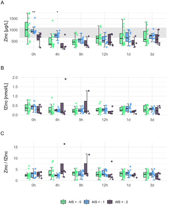 The data revealed a high variance in Zn dynamics, with significant differences observed at the first measurement point (AIS+:1 > AIS+:2, 0 h: p = 0.008) and at 4 h post-injury (AIS+:0 < AIS+:1, 4 h: p = 0.016) (Figure 5A). Additionally, high variances in fZn concentrations were specifically noted at 4 h and 9 h post-injury in patients with outstanding neurological recovery, indicating a potential fluctuation in fZn during the acute phase of spinal cord injury (Figure 5B). Despite these variances in Zn and fZn levels, no significant differences were found in the Zn to fZn ratio across different grades of neurological remission. These findings suggest that while total serum Zn may correlate with initial neurological outcomes, the variability in fZn concentrations and their ratios do not consistently align with specific neurological recovery profiles (Figure 5B,C).