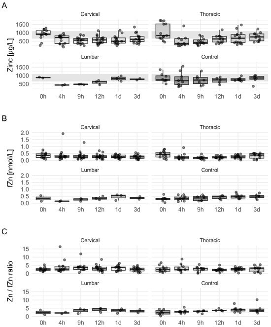 In animal and human studies, research further revealed the importance of fZn in immune function and inflammation [9,28,29]. Knowledge about the mechanisms of action of Zn on immune function and inflammatory response allows for precisely targeted intervention not only in the field of immunology but also in traumatology [30,31,32,33]. The aim of this study is to observe the changes in Zn homeostasis and the alterations in fZn and its ratio to total Zn in the context of TSCI. We are, therefore, interested in characterizing these dynamics in relation to clinical covariates such as the NLI (neurological level of injury), which might give us insights into the implications that the Zn status could have on the recovery process and general health outcomes in patients with TSCI.