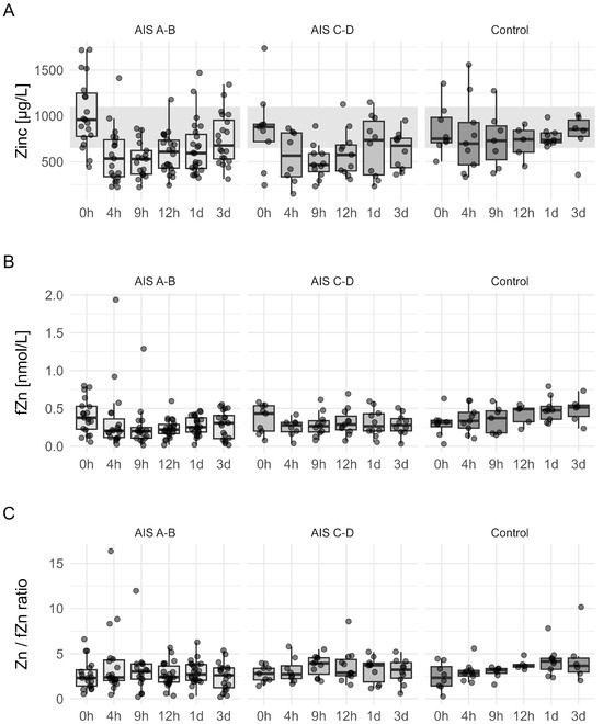 Box plots display the trends of Zn distribution, separated by initial injury severity (AIS A-B, AIS C-D) and control groups, over time following traumatic spinal cord injury (TSCI). Total serum Zn levels [g/L] were assessed at various intervals (0 h, 4 h, 9 h, 12 h, 1 d, 3 d), with the shaded region indicating the normal Zn range (650–1100 g/L) (Panel (A)). fZn levels [nmol/L] were measured at the same intervals, showing reduced fZn levels in AIS A-B patients compared to AIS C-D and control groups (Panel (B)). The Zn/fZn ratio appeared mostly constant across different groups, with slight variations over time (Panel (C)).