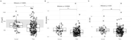 Global comparison of Serum Zn and fZn between TSCI patients and controls. (Panel (A)) features boxplots representing the total Zn levels in serum, aggregated over all time points, with a gray region denoting the normal physiological range of Zn (650–1100 g/L) for reference. (Panel (B)) illustrates boxplots of fZn levels, pooled from all collected data. (Panel (C)) presents boxplots of the ratio of total Zn to fZn. Significant differences between TSCI patients and control groups are highlighted: ns denotes , ** denotes , and *** denotes .