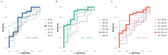 Univariate model ROC curves for predicting neurological impairment using Zn metrics. Each panel presents ROC curves calculated at various time points post-injury to evaluate the predictive power of Zn metrics for the detection of neurological impairment. (Panel (A)) features ROC curves based on total Zn concentrations, with the time point yielding the highest Area Under Curve (AUC) highlighted in a bold line. (Panel (B)) displays ROC curves for fZn, again with the most predictive time point emphasized in bold. (Panel (C)) illustrates the ROC curves for the ratio of total Zn to fZn, with the highest AUC time point distinctly marked. The AUC values are provided in the lower right corner of each panel, indicating the effectiveness of each metric at different times post-injury in predicting neurological outcomes. This visual representation underscores the temporal dynamics and diagnostic potential of Zn measurements in assessing TSCI.