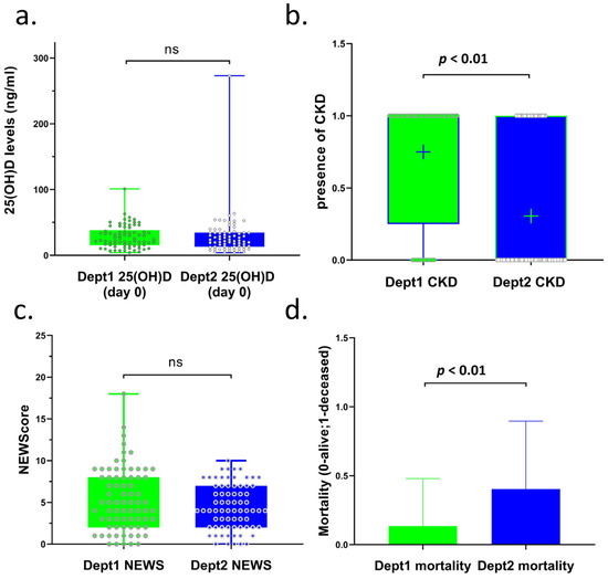Comparison of 25(OH)D concentrations, CKD stages, NEWScore 2, and mortality of COVID-19 patients in two departments of our clinic (Dept1 and Dept2). (a) 25(OH)D concentrations of COVID-19 patients in Dept1 (mean: 29) and Dept2 (mean: 29). (b) Presence of CDK in COVID-19 patients in Dept1 (median: 1) and Dept2 (median: 0). (c) NEWScore 2 of COVID-19 patients in Dept1 (median: 5) and Dept2 (median: 4). (d) Mortality of COVID-19 patients in Dept1 (mean: 10/76) and Dept2 (mean: 29/72). Interpretation of the figures: ns: not significant; significant if p < 0.05; (a) box—25–75 percentile; whiskers—min to max; dot—all patients; (b) mean signed as +; box—25–75 percentile; whiskers—min to max; (c) box—25–75 percentile; whiskers—min to max; dots—all patients; (d) box—mean; whiskers—standard deviation (SD); CKD: chronic kidney disease.