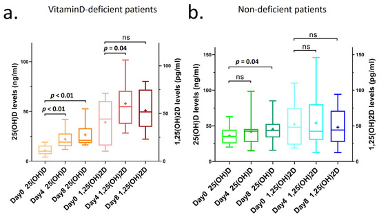 25(OH)D and 1,25(OH)2D concentrations of COVID-19 patients with supplementation in Dept1 on days 0, 4, and 8 after hospitalization. (a) 25(OH)D and 1,25(OH)2D concentrations of COVID-19 patients with vitamin D deficiency (<20 ng/mL at day 0) and after supplementation in Dept1 on days 0, 4, and 8 during hospitalization. (b) 25(OH)D and 1,25(OH)2D concentrations of COVID-19 patients with non-deficient vitamin D concentrations (≥20 ng/mL at day 0) and after supplementation in Dept1 on days 0, 4, and 8 during hospitalization. Interpretation of the figures: ns: not significant; significant if p < 0.05; line: median; mean signed as +; box: 25–75 percentile; whiskers: min to max.