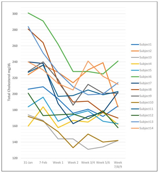 Total cholesterol levels for 14 men consuming a high-fat vs. a low-fat diet. This plot was produced from the data published in Table V of an article by Keys in 1957 including the dates [14]. The TChol results for the individual men were substantially different for January 31 and February 7, when all men were consuming an identical “house diet” with 37–42% of the total calories as fat. The results from week 1 onwards were obtained while the subjects consumed a “low-fat base diet” with 8–15% fat. Most men had a precipitous drop in TChol, reaching the lowest value between weeks 1 and 3, but it usually increased thereafter. These results show that the reliability of the data for individual prediction is low because of the large intra- and inter-individual variability.