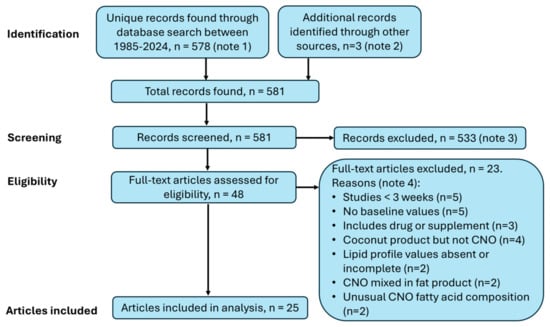 For this analysis, a PubMed.gov search was undertaken for studies of CNO reported between 1985 and 2024 using the terms “coconut oil” and “cholesterol”. This search produced 578 results (note 1); three additional results for consideration were found from other sources (Cochrane Library and previous reviews) for a total of 581 results (note 2). From this list, the following were excluded: animal and in vitro studies; studies of people under 18 years; systematic reviews of multiple studies; commentaries, opinions, letters, and case reports; reports that mentioned CNO but did not study the oil; studies that did not include the consumption of CNO, such as through topical application or an oral rinse (note 3); single-dose studies; studies with a duration of less than 3 weeks; studies of specific fatty acids rather than whole coconut oil; studies of medium-chain triglyceride (MCT) oil, which is mainly C8:0 and C10:0; studies with large deviations from the standard CNO fatty acid profile; studies in which coconut oil was part of a mixed oil product; studies that combined CNO with the initiation of a drug or supplement as an intervention; studies of coconut oil as an intervention for serious acute infection; studies of populations taking CNO for years that did not have baseline values for comparison; and studies of CNO that did not report the measurement of all four lipid profile values for a CNO test period: TChol, LDL-C, HDL-C, and TG (note 4). A search of the Cochrane Library using the terms “coconut oil” and “cholesterol” did not find any additional studies that met the criteria and were completed and reported in full-text articles. See Figure 3 for a flow diagram of the literature search.