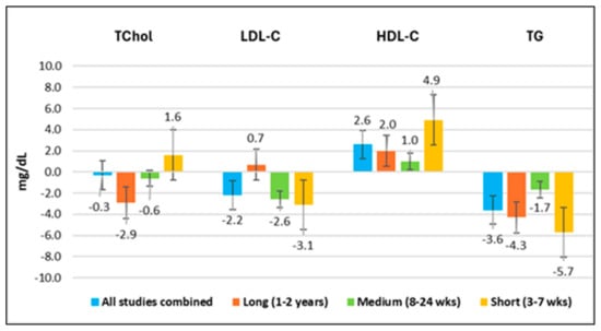 Average results were calculated for TChol, LDL-C, HDL-C, and TG in all studies combined, as well as for short-duration studies that lasted 3 to 7 weeks, medium-duration studies that lasted 8 to 24 weeks, and a long-duration study with lipid profile values available at 1 and 2 years. The long-duration study also provided lipid profile results at 3 months, which were included with the medium-duration studies. For uniformity, the data for all values were converted as needed from mmol/L to mg/dL using an online calculator (https://www.mdapp.co/cholesterol-conversion-calculator-600/, accessed on 19 September 2024), which multiplies the values in mmol/L by 38.66976 for TChol, LDL-C, and HDL-C and multiplies the value in mmol/L for TG by 88.57396 to arrive at the values in mg/dL.