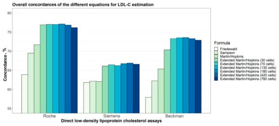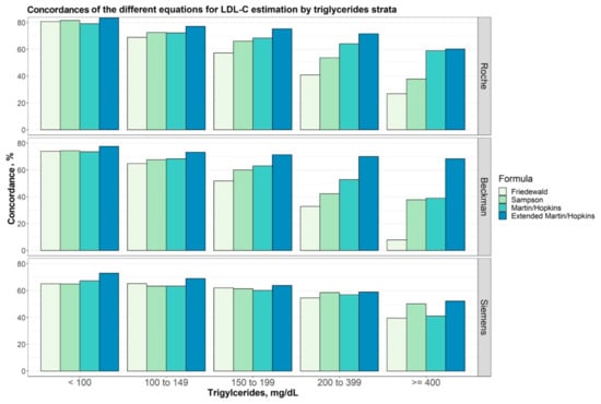 - Martin, S.S.; Blaha, M.J.; Elshazly, M.B.; Toth, P.P.; Kwiterovich, P.O.; Blumenthal, R.S.; Jones, S.R. Comparison of a novel method vs the Friedewald equation for estimating low-density lipoprotein cholesterol levels from the standard lipid profile. JAMA 2013, 310, 2061–2068. [Google Scholar] [CrossRef] [PubMed]
