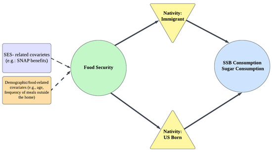 Conceptual model illustrating the interaction between food security and nativity on sugar-sweetened beverage (SSB) consumption.