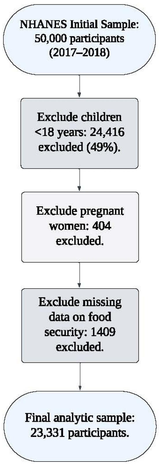 The analytic sample included 23,331 adults aged 18 and older. As shown in Figure 2, exclusions were made for pregnant women (n = 404), children under 18 years (n = 24,416), and individuals with missing data on adult food security status (n = 1409). All participants provided informed consent, and the study was conducted in accordance with the Declaration of Helsinki.