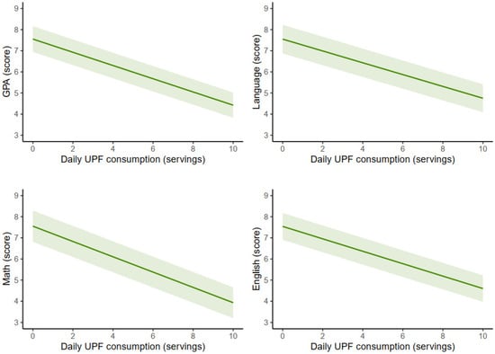 Table 2 indicates the adjusted marginal means of GPA, language, maths, and foreign language according to the status of the UPFs consumed. Overall, after adjusting for covariates, significant associations were identified. The highest UPF tertile showed the lowest academic performance and the lowest UPF tertile reported the highest academic performance. Adolescents with low UPF consumption showed the highest scores across academic performance indicators, including GPA (6.6, 95% CI 6.4 to 6.9), language (7.0, 95% CI 6.7 to 7.3), maths (6.2, 95% CI 5.9 to 6.5), and English (6.6, 95% CI 6.4 to 6.9). Similarly, those with medium UPF consumption reported slightly lower scores in GPA (6.4, 95% CI 6.1 to 6.7), language (6.7, 95% CI 6.4 to 7.0), maths (6.0, 95% CI 5.7 to 6.4), and English (6.6, 95% CI 6.3 to 6.9). In contrast, adolescents with high UPF consumption displayed the lowest academic performance scores, including GPA (5.6, 95% CI 5.4 to 5.9), language (6.0, 95% CI 5.7 to 6.3), maths (5.2, 95% CI 4.9 to 5.6), and English (5.7, 95% CI 5.5 to 6.0). The differences between high UPF consumption and low or medium UPF consumption were significant for all indicators (p < 0.05).