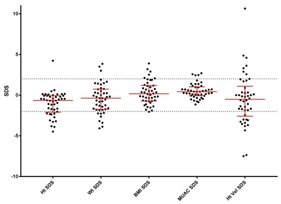 Baseline Anthropometry SDS. Standardised deviation scores for height, weight, body mass index, mid-upper arm circumference, and height velocity are shown for the entire cohort. Median scores with interquartile ranges are shown in red. The black dotted lines represent the normal reference range of −2 to +2 SD. Most children lay within the normal reference range for measurements, but compared to the reference standard, the group was shorter, with a large variation in height velocity. The variation in height velocity may represent the shifting of the normal growth curve to the right, with a delayed pubertal growth spurt and/or catch-up growth following. Abbreviations: BMI—body mass index; Ht—height; Ht Vel—height velocity; MUAC—mid-upper arm circumference; SDS—standardised deviation score; Wt—weight.