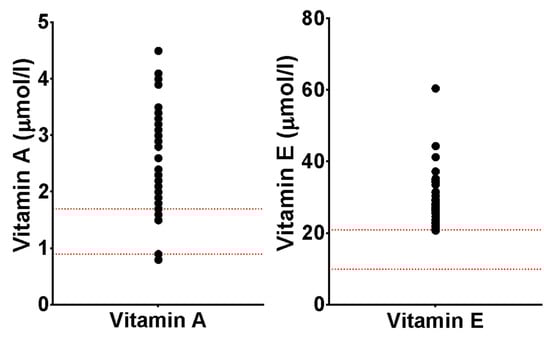 A high proportion of children had increased vitamin E concentrations (95.2%). Vitamin E has been previously reported as low [11,37], normal [12,38,39,40], and high [13]. The data reported in this study suggest that vitamin E is elevated in CKD, agreeing with Joyce et al.’s [13] reported micronutrient data in their paediatric dialysis population showing a high prevalence of elevated vitamin E in paediatric dialysis patients and higher average concentrations than in this cohort; this suggests the possibility of a “dose–response” relationship between disease severity and vitamin E, although, in these data, the correlation was not statistically significant. Similarly to the elevations in vitamin A, the increased concentrations observed are likely to be due to metabolic alteration, and as the main source of vitamin E is adipose tissue, it may be linked to the altered lipid-handling in CKD.