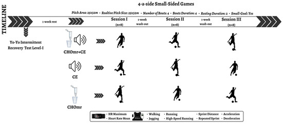 G*Power 3.1 software (G-Power, version 3.1.9.7, University of Düsseldorf, Düsseldorf, Germany) was used to determine the sample size using repeated-measures ANOVA (within-subject). Assuming a moderate effect size (f = 0.25), a significance level of 5% (α = 0.05), a statistical power of 80% (1-β = 0.80), a correlation of 0.6 between repeated measures, and sphericity (ε = 1), the minimum sample size required was 23 participants. A total of 24 amateur young male soccer players (age: 17.2 ± 0.8 years, height: 176.0 ± 5.0 cm, weight: 67.3 ± 4.5 kg, body mass index: 21.5 ± 0.7 kg/cm2; training experience: 7.2 ± 1.1 years) participated in six 4-a-side SSGs using either SSGCE, SSGCHOmr, or SSGCHOmr + CE formats. SSGs were conducted at 72 h intervals to mitigate potential positive or negative effects on performance, as suggested in previous studies [13] (Figure 1). The participants fulfilled the following criteria: (i) a minimum of three years of soccer training, including four weekly sessions (≈90 min) and one match; (ii) absence of injuries during or in the month preceding the study; and (iii) abstention from drugs or performance enhancers throughout the study. Before giving written consent, the players and their parents received information about safety measures, potential risks, and assessment procedures. The primary objective of this study was not fully disclosed to prevent influencing outcomes. All the participants confirmed that they had no prior experience with the practice and were unaware of its benefits. This study was approved by the Research Ethics Committee and adhered to the guidelines of the Declaration of Helsinki.