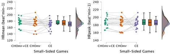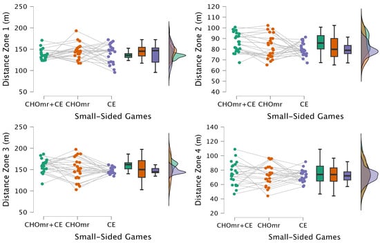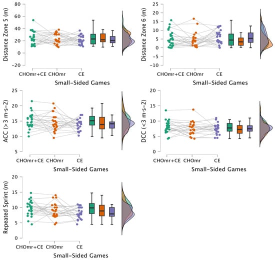 This study aimed to compare the effects of CE and CHOmr or CHOmr + CE interventions on kinematic profiles of four-a-side SSGs in young male soccer players. To our knowledge, this is the only study to compare CHOmr interventions and CE during game-based soccer training. Our results indicated that there was no significant difference between the training modification CE and nutritional strategy CHOmr intervention or CHOmr + CE on HR responses and distance in speed zones (1: standing, 2: walking; 3: jogging, 4: running, 5: high-speed running, and 6: sprinting), repeated sprints, acceleration, and deceleration during SSGs. There was only a significant difference in distance in Speed Zone 2 (walking), in which the CHOmr + CE group showed a greater distance.