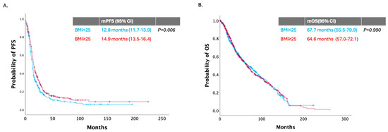 Kaplan–Meier curves of: (A) PFS, and (B) OS according to BMI in the overall population with BMI ≥ 25 kg/m2 (red line) and BMI < 25 kg/m2 (blue line).