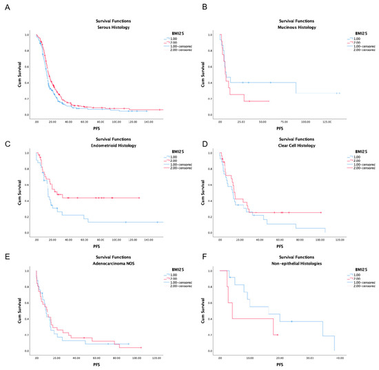 Kaplan–Meier curves of PFS according to BMI (BMI ≥ 25 kg/m2 (red line) and BMI < 25 kg/m2 (blue line) in different histological types (serous carcinoma (A), mucinous carcinoma (B), endometrioid carcinoma (C), clear cell carcinoma (D), adenocarcinoma not otherwise specified (E), non-epithelial carcinoma (F)).