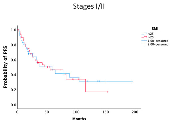 Kaplan–Meier curves of PFS according to BMI (BMI ≥ 25 kg/m2 (red line) and BMI < 25 kg/m2 (blue line) in disease stage I/II.