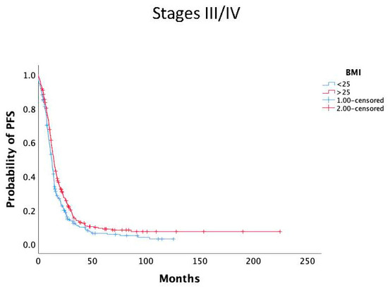 Kaplan–Meier curves of PFS according to BMI (BMI ≥ 25 kg/m2 (red line) and BMI < 25 kg/m2 (blue line) in disease stage III/IV.