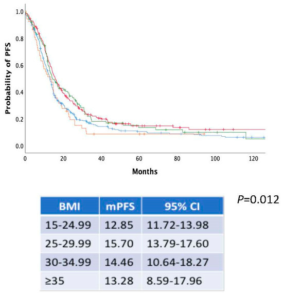 Kaplan–Meier curves of PFS according to BMI categorized as normal weight (BMI 15–24.99 kg/m2) (blue line), overweight (BMI 25–29.99 kg/m2) (red line), obese class I (BMI 30–34.99 kg/m2) (green line) and obese class II (BMI > 35 kg/m2) (orange line).