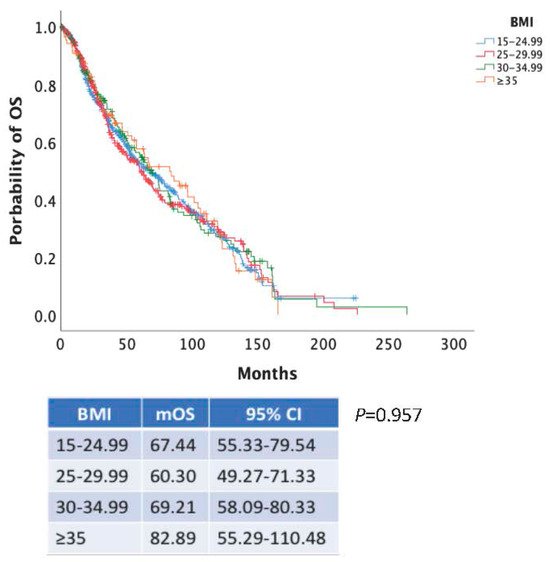 Kaplan–Meier curves of OS according to BMI categorized as normal weight (BMI 15–24.99 kg/m2) (blue line), overweight (BMI 25–29.99 kg/m2) (red line), obese class I (BMI 30–34.99 kg/m2) (green line) and obese class II (BMI > 35 kg/m2) (orange line).