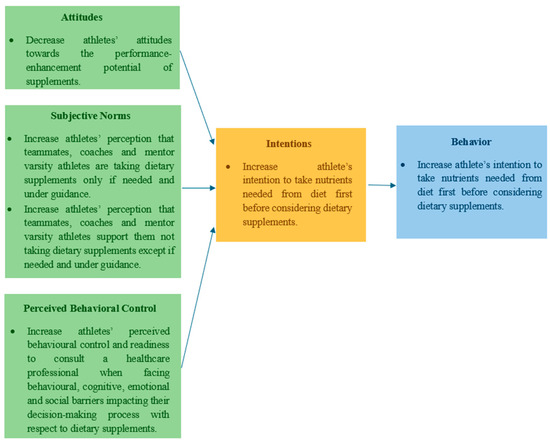 This study aimed at investigating the effectiveness of an online nutrition education program in influencing intentions and related determinants towards the use of dietary supplements in varsity athletes. The objectives of this study were to (1) decrease athletes’ attitudes towards the performance-enhancement potential of supplements, (2) increase athletes’ perception that teammates, coaches, and mentor varsity athletes are taking dietary supplements only if needed and under guidance (after diet alone has been considered), (3) and that teammates, coaches and mentor varsity athletes support them not taking dietary supplements except if needed and under guidance, (4) increase athletes’ perceived behavioral control and readiness to consult a healthcare professional (i.e., sports doctor, registered dietitian, etc.) when facing behavioral, cognitive, emotional, and social barriers that impact their decision-making process with respect to dietary supplements, and (5) increase athlete’s intention to take nutrients needed from diet first before considering dietary supplements (Figure 2).