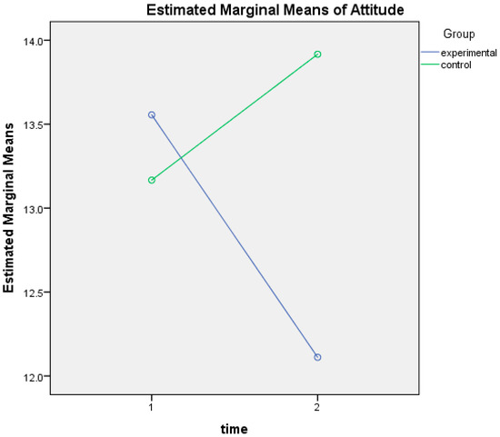 There was a statistically significant interaction between the intervention and time on attitude to use dietary supplements, F(1, 28) = 4.89, p = 0.035, and partial η2 = 0.149. Varsity athletes in the intervention group showed, over time, a decrease in positive attitudes towards the ability of dietary supplements to improve performance or health (Mean(time1) = 13.56; SD(time1) = 2.81; and Mean(time2) = 12.11; SD(time2) = 3.45), while athletes in the control group showed an opposite pattern over time, as their attitude scores increased (Mean(time1) = 13.17; SD(time1) = 2.98; and Mean(time2) = 13.92; SD(time2) = 3.20) (Figure 4).