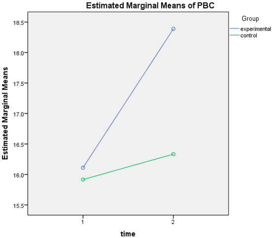 There was a statistically significant interaction between the intervention and time on the perceived behavioral control towards using dietary supplements, F(1, 28) = 4.77, p = 0.038, and partial η2 = 0.145. After the intervention, participants in the experimental group exhibited a significantly stronger perception of the ability to control their decision to use or not use dietary supplements (Mean(time2) = 18.39; SD(time2) = 1.72), compared to the control group (Mean(time2) = 16.33; SD(time2) = 2.57), p = 0.014. PBC scores were statistically significantly higher after the intervention (Mean(time2) = 18.39; SD(time2) = 1.72) for the experimental group compared to pre-intervention (Mean(time1) = 16.11; SD(time1) = 2.06), p = 0.002 (Figure 5).