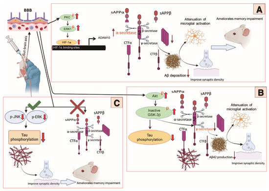 Summary of the effect of B. breve MCC1274 on AppNL–G–F and WT Mice. (A) In 6-month-old AppNL–G–F mice, oral supplementation with B. breve MCC1274 alleviated cognitive dysfunction and reduced Aβ deposition by increasing the ADAM10 protein level in the hippocampus. This treatment also helped alleviate neuroinflammation and improved synaptic density. (B) In WT mice, supplementation with B. breve MCC1274 decreased levels of soluble Aβ42 and PS1 proteins through the Akt/GSK–3β signaling pathway. It also attenuated microglial activation and inhibited tau phosphorylation, which may enhance synaptic function. (C) In 17–month–old AppNL–G–F mice, administration of B. breve MCC1274 may provide ameliorative effects by reducing chronic stress. This is achieved by inhibiting tau hyperphosphorylation through the p–JNK and p–ERK pathways, as well as improving synaptic density.