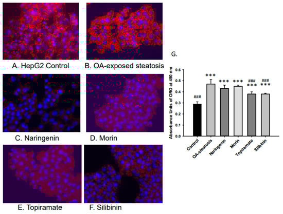 Lipid accumulation measured by absorbance of Oil Red O (ORO). Intracellular lipid accumulation was determined after ORO staining using a microplate reader. Data represents means ± standard deviation of the mean (SD) with n = 6 wells of cells for each group. Photos were taken at 40× magnification. (A). HepG2 untreated control, (B). OA-steatosis DMSO control, (C). naringenin-treated steatotic cells, (D). morin-treated steatotic cells, (E). topiramate-treated steatotic cells, and (F). silibinin-treated steatotic cells. (G). Measured absorbance units (AU) of treatment groups stained with ORO measured at 490 nm. Compared to HepG2 controls: *** p < 0.001. Compared to the OA-steatosis group: ### p < 0.001.