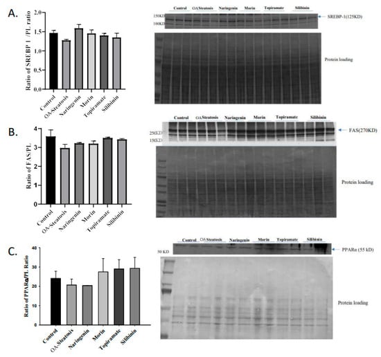 Western blotting of SREBP, FAS, and PPARα. Western blotting was performed on protein extracted from cell pellets. Signal intensity was analyzed relative to that of protein loading bands.
