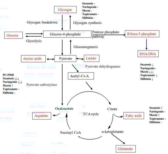 This study was designed to investigate the effects of three flavonoids and topiramate on glucose-derived carbon flux in a HepG2 cell culture model of steatosis. We examined outcomes related to three main pathways through which glucose enters as glucose-6-phosphate: glycogen synthesis, the pentose phosphate pathway, and glycolysis, which produces pyruvate to enter the mitochondria into the TCA cycle. For the interventions, unlike many in vitro studies that have used high doses, we used relatively low doses (flavonoids 10 µM, topiramate 44 µM) that are physiologically relevant to the concentrations found in human blood after ingestion. For example, serum concentrations of naringenin in healthy subjects who ingested a single dose of 150 mg naringenin were found to be 15.76 ± 7.88 μM [21].