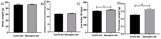 The results of the murinometric profiles indicate that the maternal diet causes increases in the Lee Index and in the weight of the pancreas in the offspring at 30 days of life, but the body weight was not found to be statistically different. These findings indicate an increased propensity for obesity with augmented pancreatic tissue. A study conducted by [] utilizing a maternal obesogenic diet model revealed that male and female offspring at 21 days of life exhibited no alterations in their body weight and lean mass, a finding that is consistent with our data. However, the same study demonstrated that the total body fat ratio was elevated in the group that was subjected to the dietary regimen []. Although it is already established that the consumption of an obesogenic diet can contribute to the development of obesity, as evidenced by the findings of [] with Sprague Dawley rats, it was demonstrated that the consumption of high-fat diet for a period of 12 weeks resulted in the development of obesity, and this was accompanied by an increase (36.9%) in body weight and elevated glycemic levels at both 45 and 120 min during the oral glucose tolerance test (OGTT) and insulin resistance test.