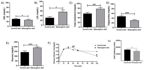 The biochemical profiles and GTT of the offspring at 30 days of life. (A) HDL levels, (CD: n = 6 OD: n = 7) (* p = 0.011); (B) LDL levels, (CD: n = 7 OD: n = 7) (* p = 0.032); (C) total cholesterol levels (CD: n = 5 OD: n = 5) (*** p = 0.004); (D) triglyceride levels (CD: n = 5 OD: n = 5) (**** p < 0.0001); (E) glucose levels (CD: n = 5 OD: n = 6) (**** p < 0.0001); (F) glucose tolerance test (GTT) (CD: n = 5 OD: n = 6) (** p = 0.007, * p = 0.039); and (G) area under the curve (AUC) of the GTT (CD: n = 5 OD = n = 6) (* p = 0.030). Data are expressed as the mean ± SEM using the unpaired Student t test.