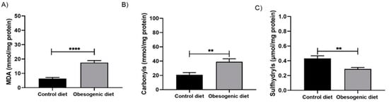 After obtaining the pancreatic tissue homogenate and protein dosage, assays were performed to measure oxidative stress biomarkers and total thiols. Regarding lipid peroxidation, an increase in the MDA levels was observed in the OD group (Figure 3A) (C: 6.320 ± 0.854, n = 6 vs. OD: 17.49 ± 1.448, n = 6, p < 0.0001), as well as an increase in the protein oxidation levels (C: 20.80 ± 3.199, n = 6 vs. OD: 39.07 ± 4.168, n = 6, p = 0.006) (Figure 3B). These results are expressed in μg/mg protein. Furthermore, there was also a decrease in the pancreatic sulfhydryl levels (C: 0.43 ± 0.036, n = 7 vs. OD: 0.29 ± 0.019, n = 7, p = 0.005). These results are expressed in M/mg protein, as seen in Figure 3C.