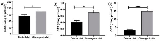 The enzymatic antioxidant system consists of a series of enzymes that are aimed at eliminating reactive species or transforming them into molecules that are less harmful to the body. The enzymatic antioxidant system was increased in the OD group in the kinetics of all the enzymes analyzed. Thus, an increase in SOD activity was observed (CD: 141.9 ± 11.61, n = 6 vs. OD: 177.4 ± 8.81, n = 7, p = 0.030), as well as in CAT (CD: 0.403 ± 0.05, n = 7 vs. OD: 0.707 ± 0.07, n = 6, p = 0.007) and GST (CD: 3.23 ± 0.36, n = 6 vs. OD:14.97 ± 0.65, n = 6, p < 0.0001), (Figure 4A–C). These results are expressed in U/mg of protein.