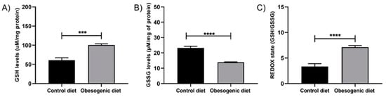 The non-enzymatic antioxidant systems of the offspring at 30 days of life. (A) GSH levels (CD: n = 7 OD: n = 7), (*** p = 0.0001); (B) GSSG levels (CD: n = 6 OD: n = 7) (**** p < 0.0001); and (C) REDOX state (CD: n = 6 OD: n = 7) (**** p < 0.0001). Data are expressed as the mean ± SEM using the unpaired Student t test.