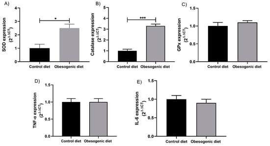 Regarding the gene expression of the antioxidant enzymes, it was seen that SOD (Figure 6A) increased (CD: 1 ± 0.30, n = 4 vs. OD: 2.50 ± 0.30, n = 3, p = 0.018), and the same also occurred with CAT (CD: 1 ± 0.150, n = 4 vs. OD: 3.30 ± 0.173, n = 3, p = 0.0002) (Figure 6B), although GPx (Figure 6C) did not show a significant difference. The evaluation of inflammatory process was analyzed by IL-6 (Figure 6D) and TNF-α expression (Figure 6E), and these results are expressed and were quantified according to the 2−∆∆CT calculation. The results showed no significant difference in any of the inflammatory markers evaluated.