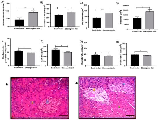 The histomorphometries and histologies of the pancreatic tissue of the offspring at 30 days of life. (A) Number of cells for islet (CD: n = 6, OD: n = 6) (** p = 0.007); (B) perimeter of the islet (CD: n = 6, OD: n = 6) (* p = 0.015); (C) islet diameter (CD: n = 6, OD: n = 6) (*** p = 0.0005); (D) islet area (CD: n = 6, OD: n = 6) (* p = 0.011); (E) number of cells in the pancreatic acini (CD: n = 6, OD: n = 6) (* p = 0.031); (F) acini area (CD: n = 6 OD: n = 6) (* p = 0.022); (G) diameter of acini (CD: n = 6 OD: n = 6) (* p = 0.024); (H) perimeter of acini (CD: n = 6 OD: n = 6) (* p = 0.028); (I) photomicrograph of the pancreas of the control animals; (J) photomicrograph of the pancreas of the obesogenic animals. Blue arrows indicate pancreatic islets. Green arrows indicate pancreatic acini. The yellow arrow indicates a damaged islet with vacuoles in its center. Data are expressed as the mean ± SEM using the unpaired Student’s t test.