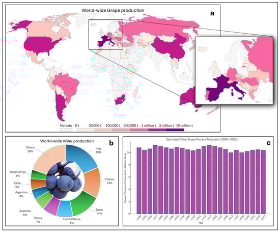 (a) World map chart illustrating grape production by geographic region (adapted from Food and Agriculture Organization of the United Nations (2023)—with major processing by Our World in Data); (b) Pie chart showing the countries with the highest wine production; (c) Histogram representing the estimated global grape pomace production from 2000 to 2023. The values are based on trends in global wine production and assume an average pomace yield of 25% of the total grape weight.