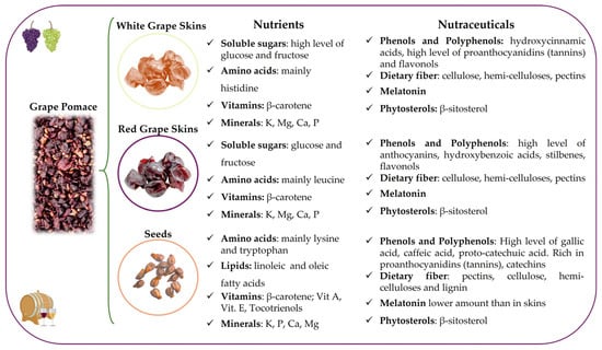 The rich variety of nutrients and nutraceuticals present in GP, summarized in Figure 2, highlights the high potential value of what, until a few years ago, was considered a waste product.