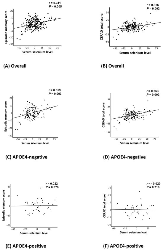 Serum Se levels interacted significantly with APOE4 positivity, impacting EMS (B = −0.074, 95% CI: −0.109 to −0.039, p < 0.001) and TS (B = −0.069, 95% CI: −0.128 to −0.010, p = 0.022), but showing no significant effect on NMS or the three non-memory tests (Table 3 and Table S1). This indicates that APOE4 moderates the associations between serum Se levels and episodic memory as well as global cognition, without affecting non-memory cognitive domains or individual non-memory tests (verbal fluency for executive function/attention/language, modified Boston Naming Test for language, and constructional praxis for visuospatial and perceptual skills). In APOE4-negative participants, serum Se levels were significantly associated with EMS (B = 0.072, 95% CI: 0.025 to 0.119, p = 0.003) and TS (B = 0.125, 95% CI: 0.046 to 0.204, p = 0.002), while no significant associations were found in the APOE4-positive subgroup (Table 4 and Figure 1C–F).