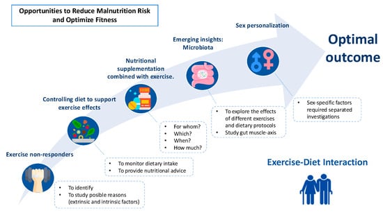 Moreover, several challenges remain in exercise for older adults, including identifying non-responders—individuals who do not show the expected improvements in fitness or health outcomes after following an exercise regimen []. This variability may be due to a range of factors, including intrinsic elements such as genetic predispositions, low-grade inflammation, or chronic diseases, as well as extrinsic factors like medication, baseline fitness levels, and adherence to exercise protocols []. However, as discussed in subsequent sections, nutritional interaction factors, such as dietary inadequacies or gut microbiota composition, could also contribute to these non-responses.