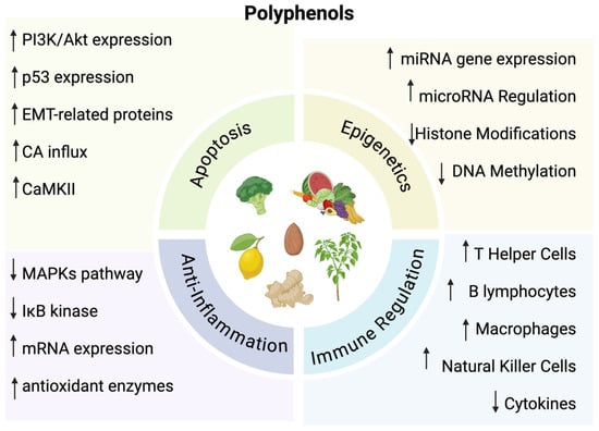 ↑ = Indicates increase; ↓ = Indicates decrease. The diverse functions of polyphenols. Created in BioRender. Lab, T. (2024) https://BioRender.com/l10i067 (accessed on 7 December 2024) [7,8,9,10].