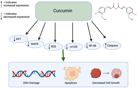 Effects of Curcumin on cancer. Curcumin affects many pathways including the AKT, MAPK, ROS, mTOR, NF-kB, and Caspase pathways. This leads to DNA damage, apoptosis, and decreased cell growth. Created in BioRender. Lab, T. (2025) https://BioRender.com/u13o398 (accessed on 5 February 2025) [39,40].