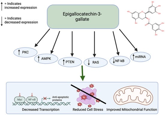 Effects of EGCG on cancer. EGCG affects many pathways, including the PKC, AMPK, PTEN, RAS, NF-kB, and cAMP pathways. This leads to improved mitochondrial function, reduced cell stress, and decreased transcription. Created in BioRender. Lab, T. (2024) https://BioRender.com/s56n309 (accessed on 7 December 2024) [57,58].