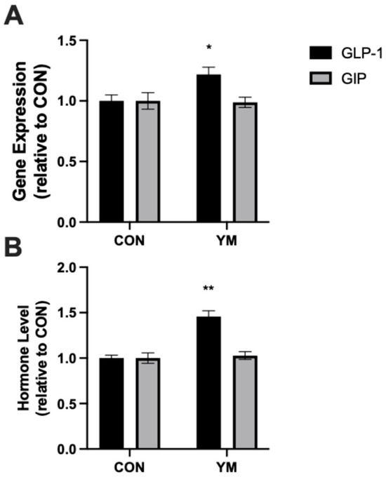Consistent with the upregulation of GLP-1 gene expression, plasma levels of active GLP-1 were significantly higher in YM-treated mice compared to controls (Figure 1B, p < 0.01). However, plasma levels of GIP remained unchanged between the two groups.