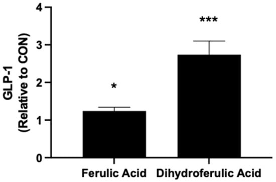 Effects of ferulic acid and dihydroferulic acid on GLP-1 secretion in L-cells. GLUTag cells were treated with ferulic acid or its microbial metabolite, dihydroferulic acid, for 24 h, and GLP-1 levels in the supernatant were quantified. Data are presented as mean ± SEM and expressed relative to CON as fold change. * p < 0.05 vs. CON, *** p < 0.001 vs. CON.