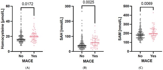 (A–C). Participants with MACE (major cardiovascular events) had significantly higher levels of plasma homocysteine (p = 0.0172), plasma S-adenosylhomocysteine (SAH; p = 0.0025) and plasma S-adenosylmethionine (SAM; p = 0.0069) than participants without MACE. Data are shown as scatter plots.