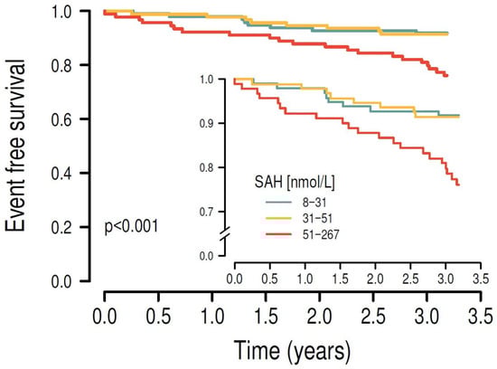 After stratifying the study cohort by their plasma SAH levels into tertiles, higher plasma SAH levels were significantly associated with the primary endpoint in univariate Kaplan–Meier survival analysis (p < 0.001).